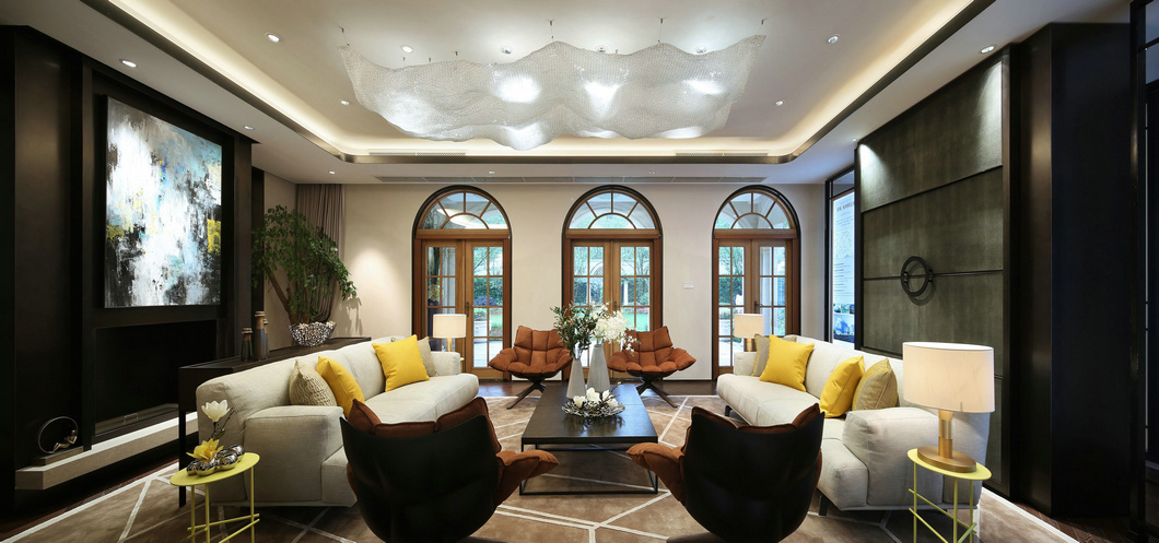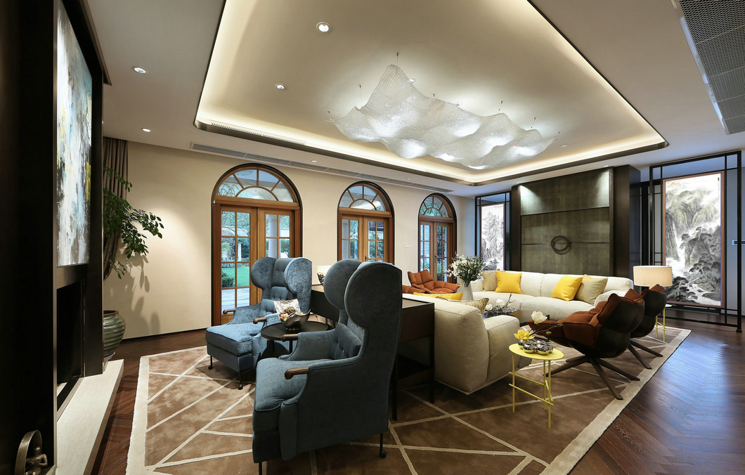 整個戶型格局為兩層帶地下室。風格定位為新都市現代風格。適合現代生活需求的同時,向傳統審美致敬。藍色算是塑造寧靜感覺的更佳色彩,在以白色為背景的硬裝里,黃昏藍和氣質米的現代沙發讓空間冷靜、沉穩。沙色的地毯適度地緩解了空間高冷氣息,另外點綴色選用了嬰兒黃,提亮空間,引人注意之外,也增加了空間的層次感。適量的皮革搭配,讓現代里又帶上了一絲不一樣的質感。用材質和顏色的混搭來區分空間的功能性以及不同年齡客戶的生活需求。這里有沙色的土壤,洗凈的藍天,平靜的大海,每天睜開眼你都是快樂的。
