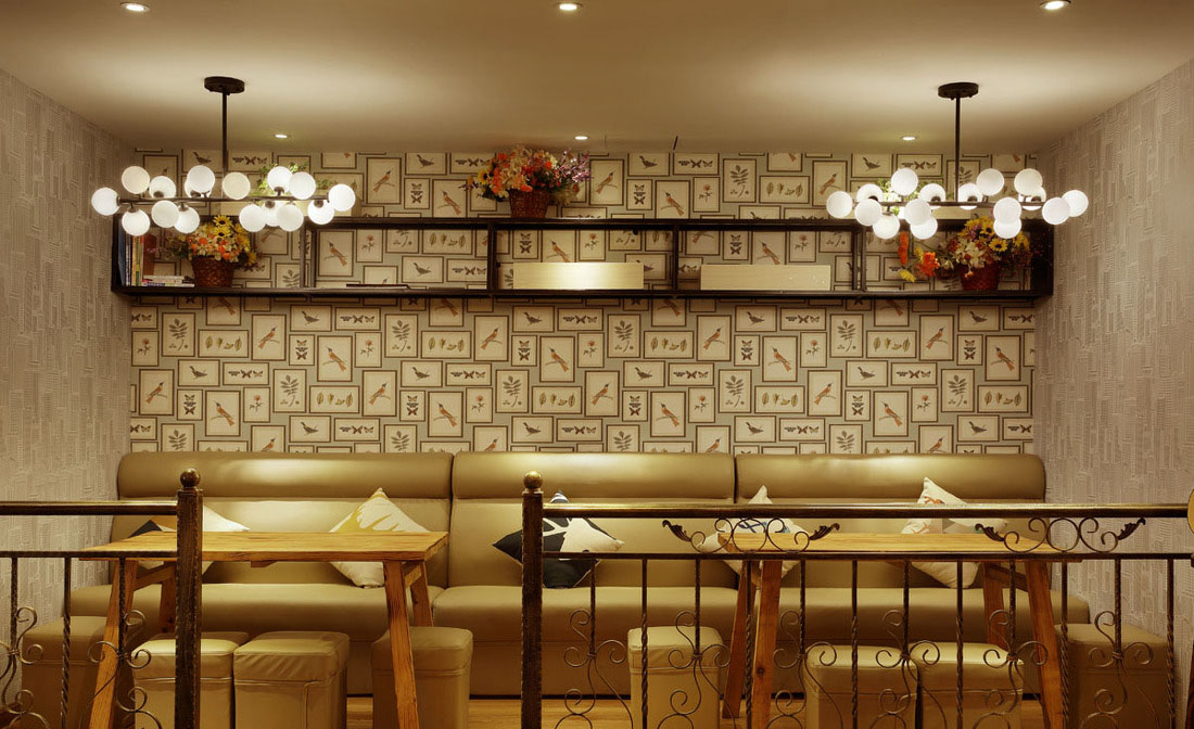 原來的棋牌室地面抬高,入口處加了地燈,墻面獨特挑選的墻紙和色彩的乳膠漆裝飾,原來的沉悶感一掃而空。在酒吧一角增加了駐唱的位置和投影儀,在這里有歌手的專業演繹,客人沉醉在音樂中,讓人流連忘返。另外為了空間更加豐富,我們在大廳抬高了兩塊位置,用鐵藝欄桿和隔斷區分空間,特別定制的木格則讓空間增色不少。