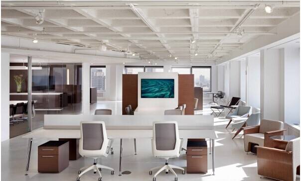 白色作為一個可以映襯一切的底色,光線配合會很大程度影響到視覺感,是否足夠明亮,或是有些區域適合柔和的光線。環境影響人的情緒和心理感受,我們在辦公室裝飾設計的光線燈飾布局當中應滿足照明需求,同時增加空間的層次感,燈具本身也是裝飾的一部分。常見燈飾主要分為吊燈、筒燈、射燈、洗墻燈、燈箱、DIY等光源色溫,根據不同照明需求選擇冷光、中性光、暖光,裝修之前需要跟設計師充分溝通,預留好所需電源、插座。